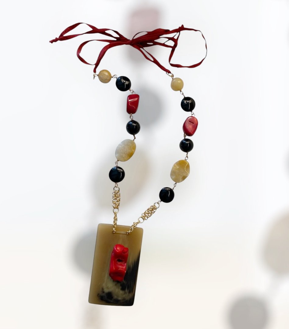 Una composizione di elementi naturali e forme irregolari che dialogano tra loro in equilibrio: il rosso intenso del Bamboo corallo, i toni profondi dell'onice nera lucido e le sfumature chiare del diaspro creano un contrasto armonioso e raffinato.